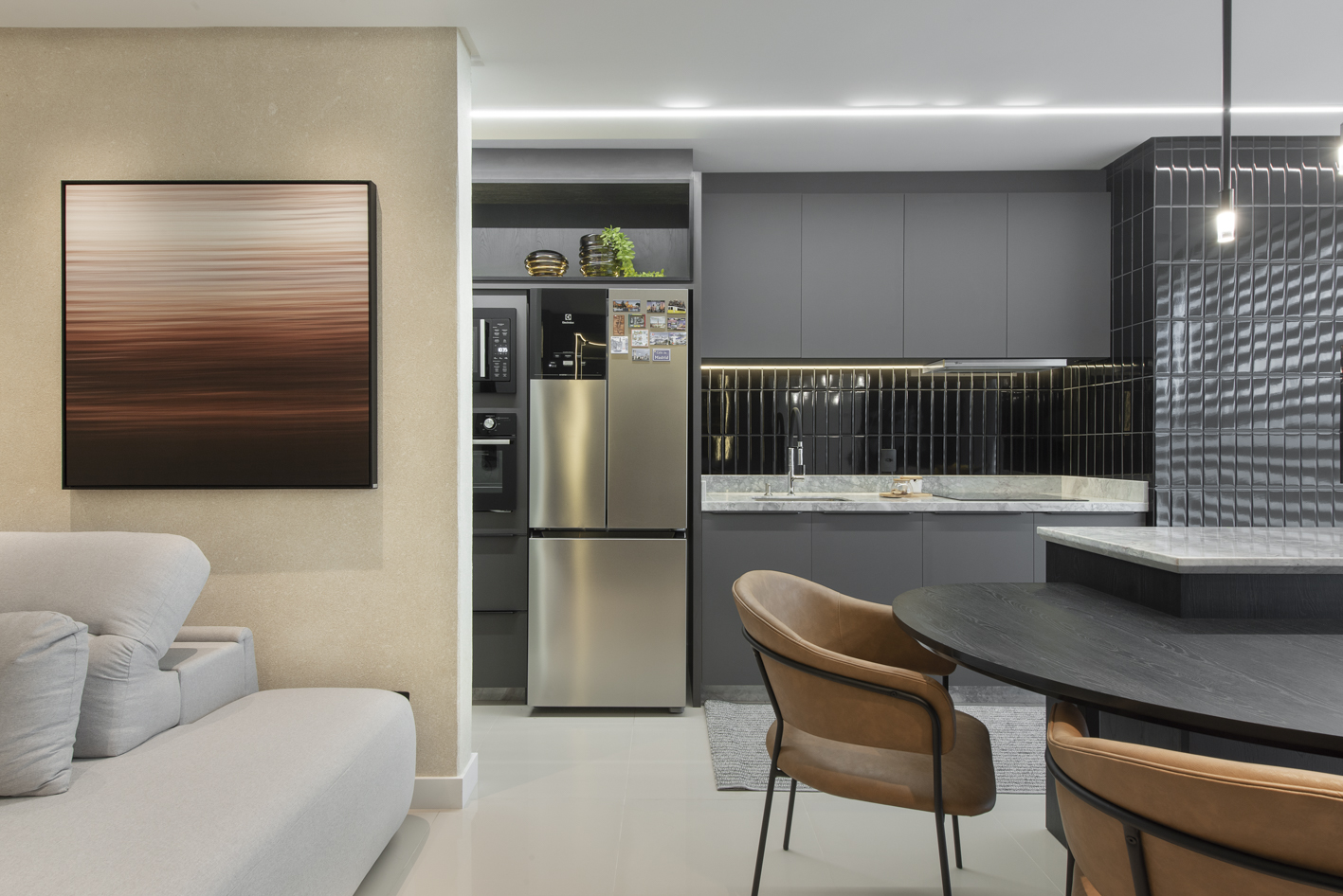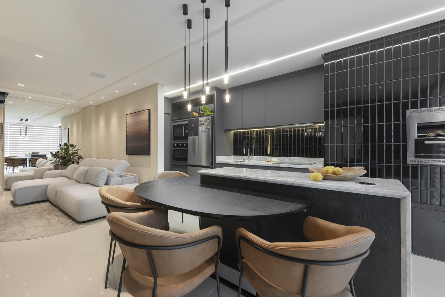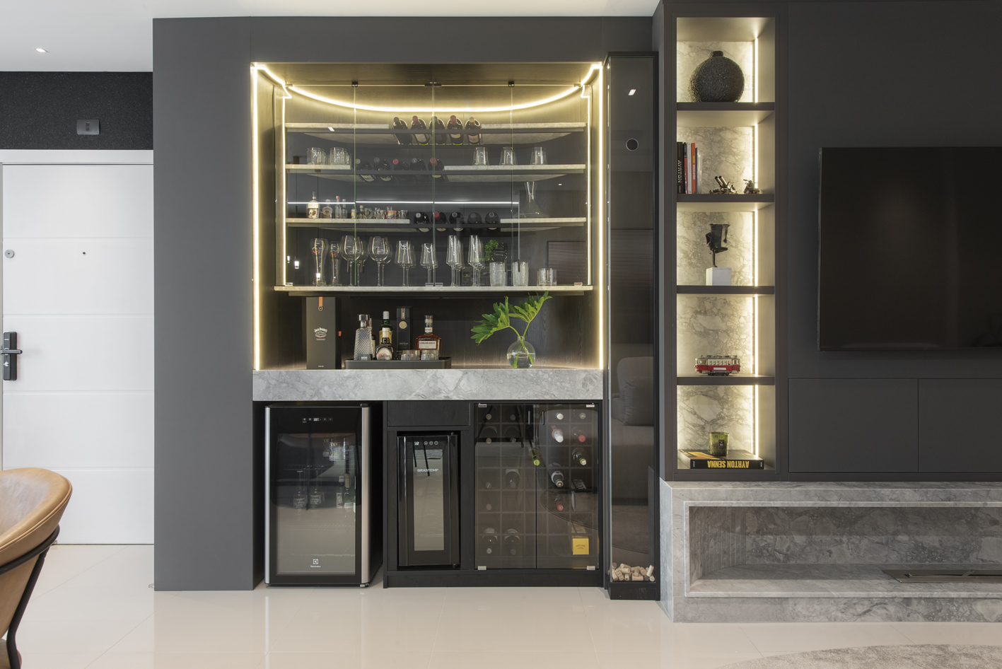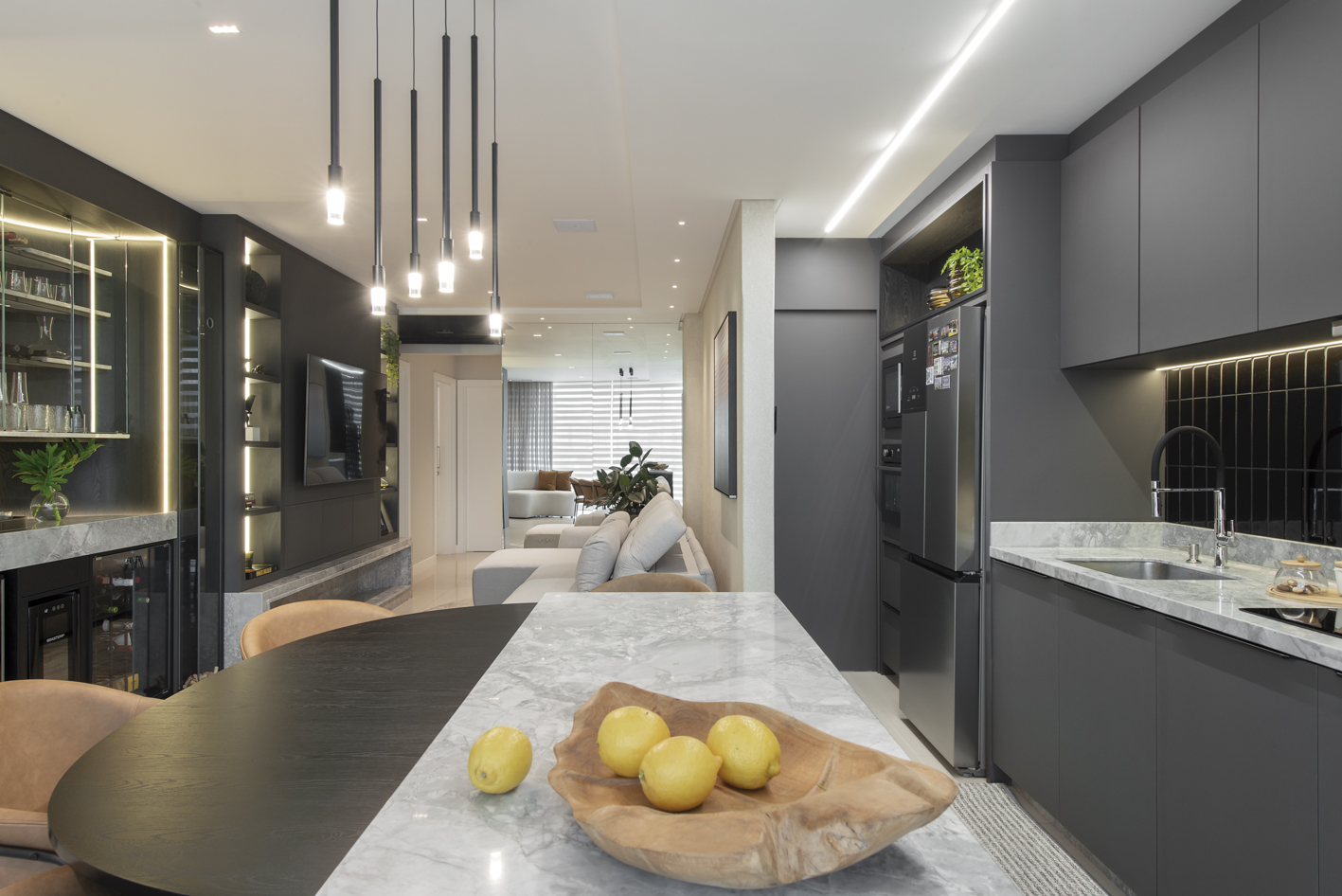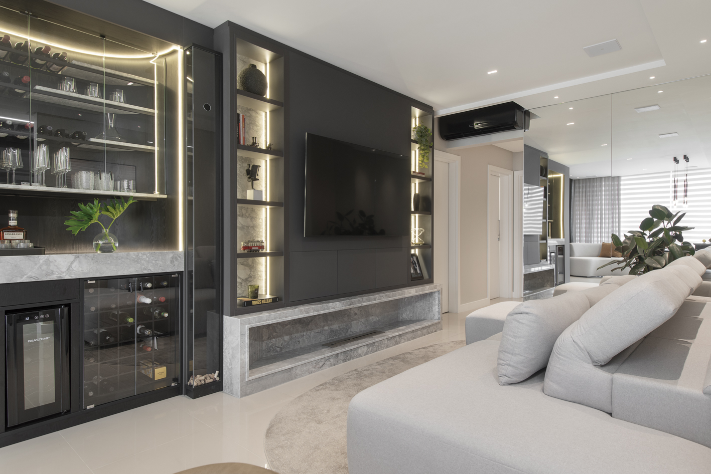 Projeto de marcenaria sob medida concebido para estabelecer continuidade visual entre os ambientes, com atenção especial à modulação, alinhamento dos painéis e proporção dos volumes. A solução privilegia acabamentos clean, ergonomia funcional e fluidez espacial.