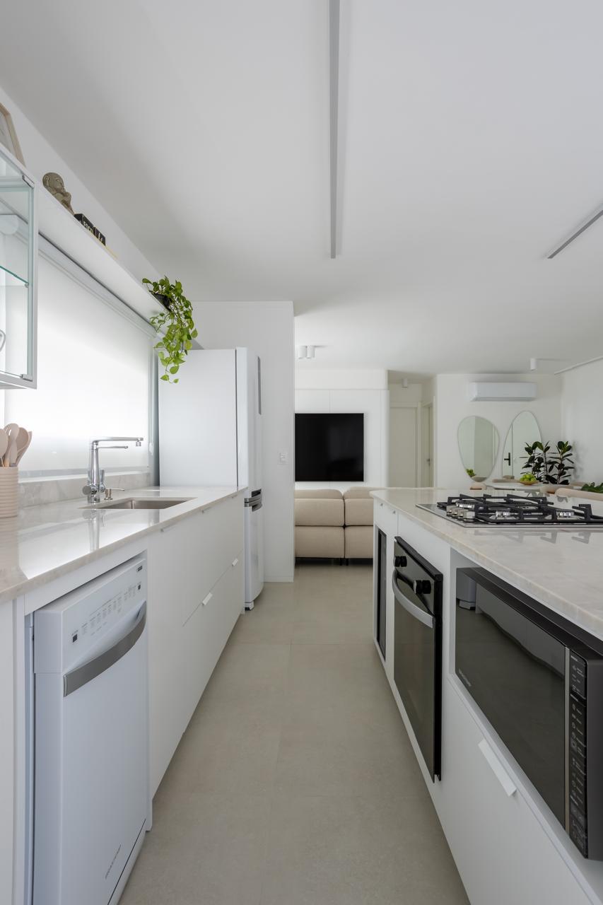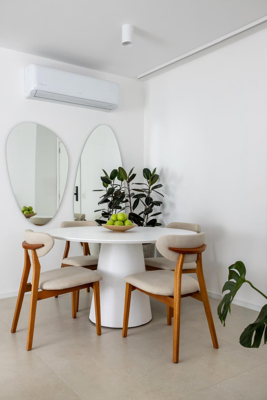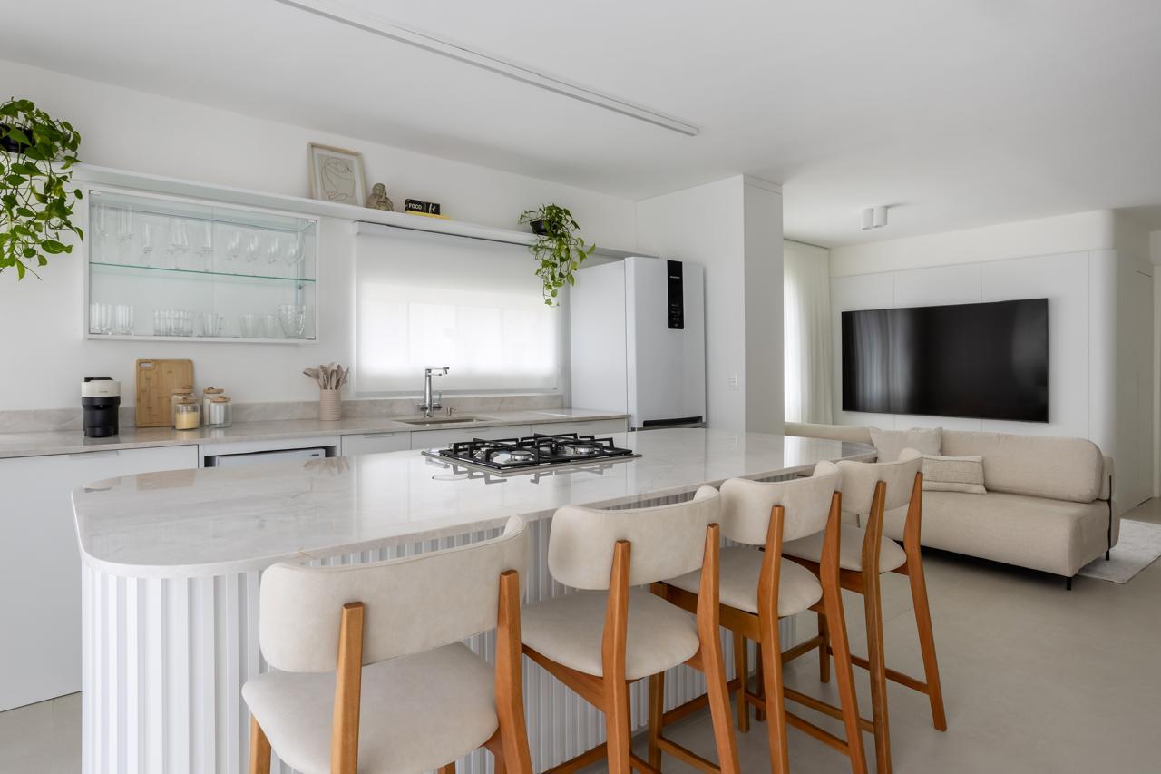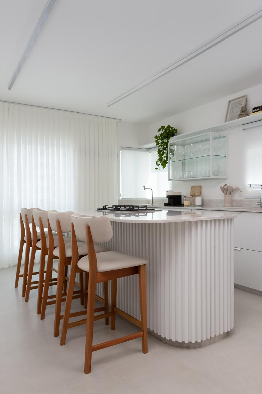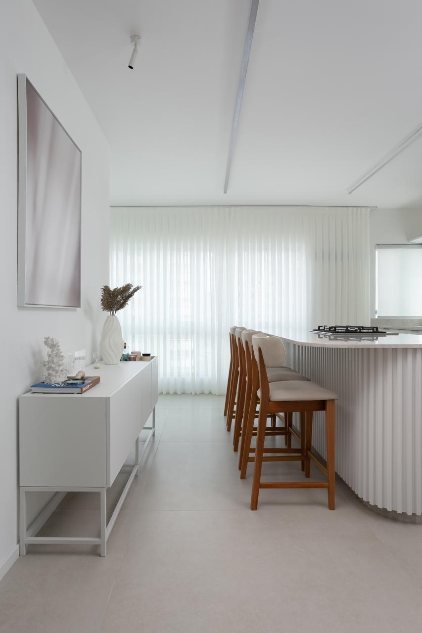 Executado pelo Escritório 2D Arquitetura, o projeto explora uma paleta limpa e luminosa, com marcenaria sob medida integrada ao layout fluido. Linhas suaves, volumetria leve e mobiliário orgânico reforçam a sensação de amplitude e conforto em todos os ambientes.