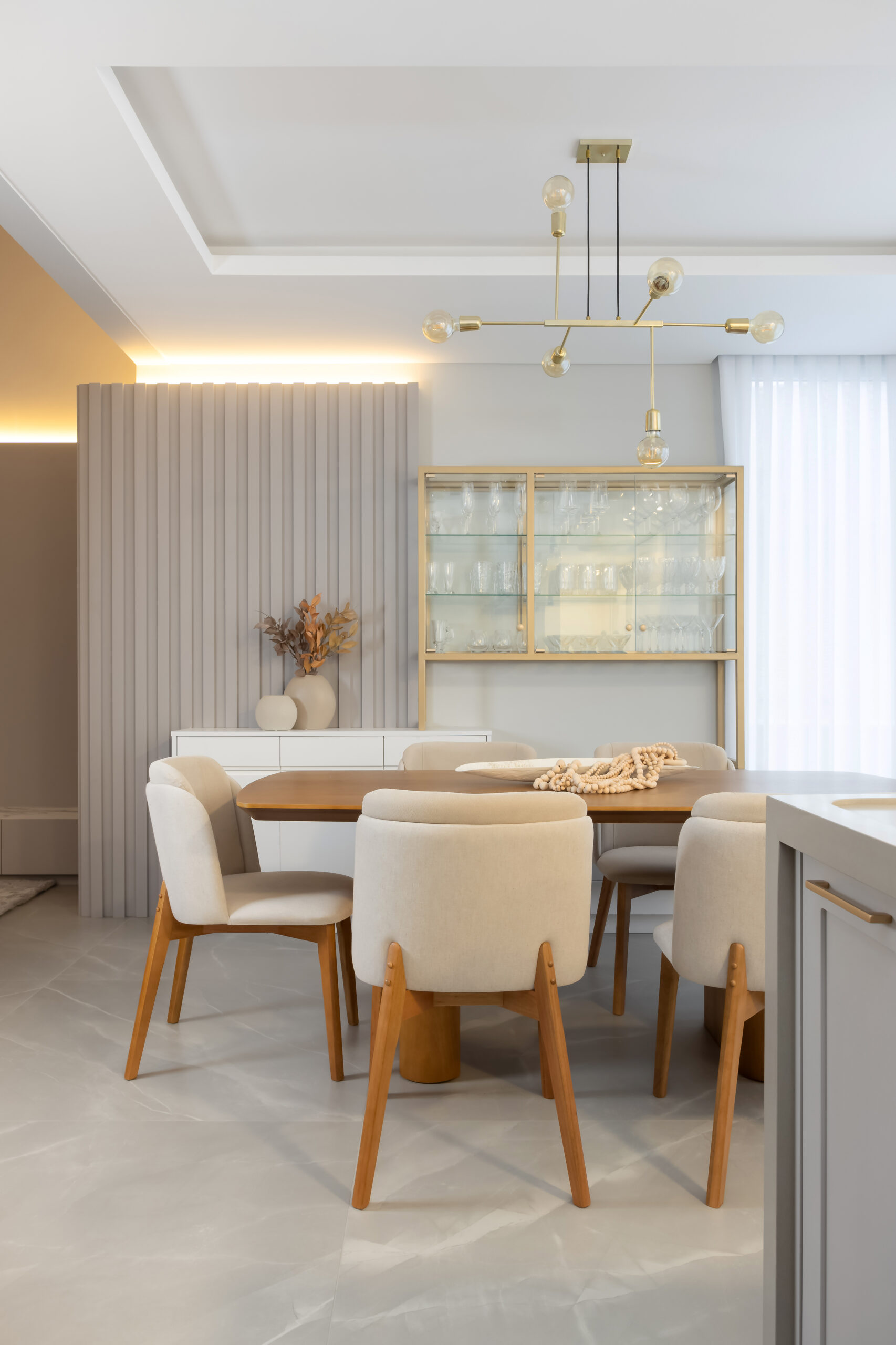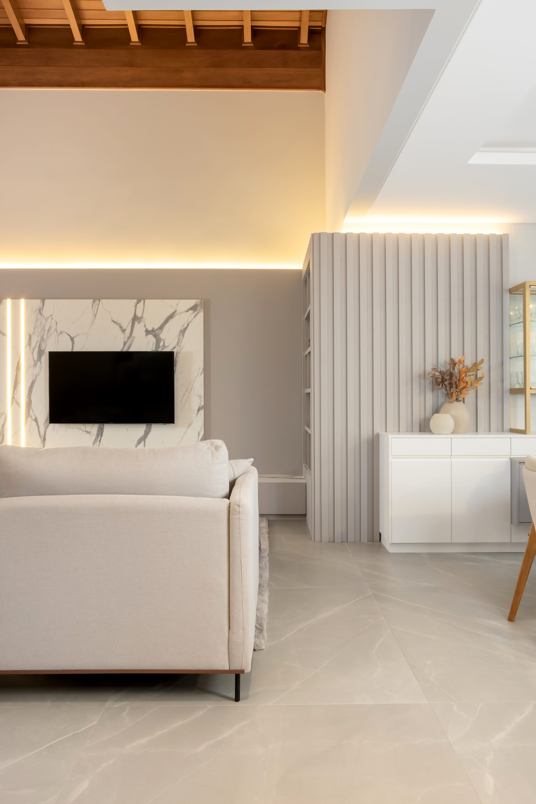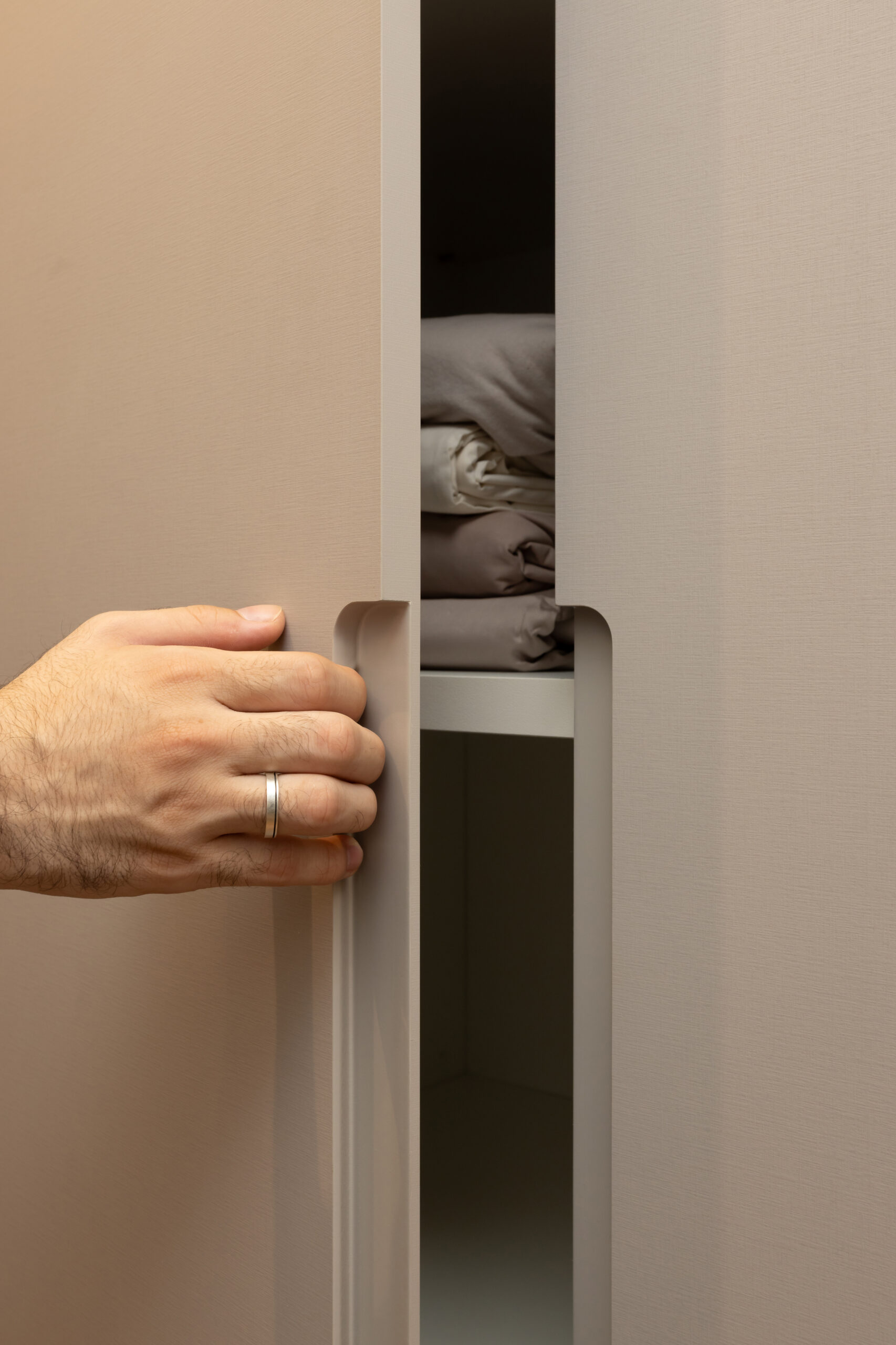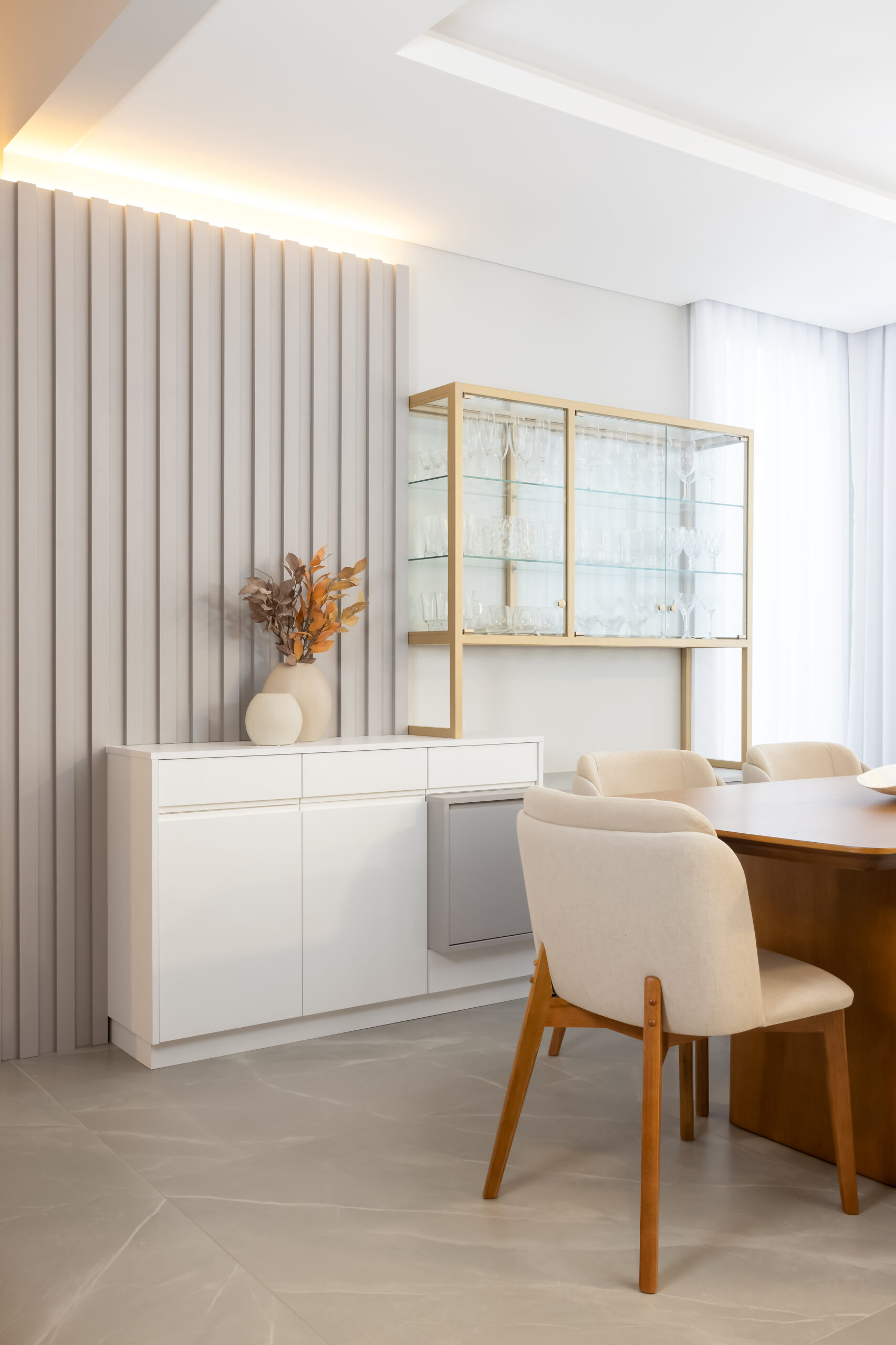 Neste projeto, a marcenaria foi concebida para dialogar com o ritmo volumétrico e a materialidade do espaço arquitetônico, oferecendo módulos planejados que se integraram aos eixos estruturais existentes. A partir de uma leitura criteriosa do entorno e da circulação, a intervenção sob medida visou garantir continuidade visual entre ambientes, aliando proporção, alinhamento e ergonomia.