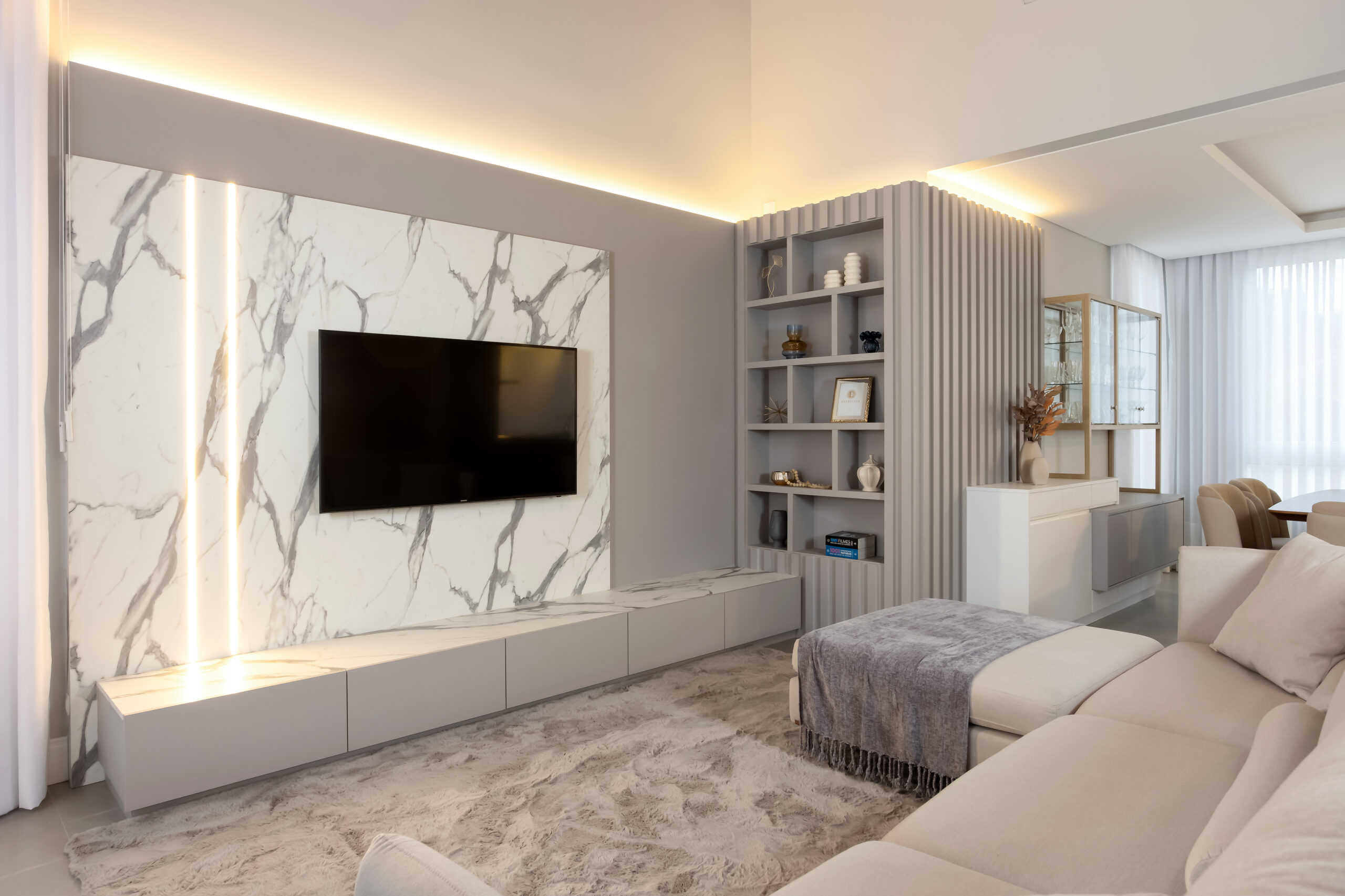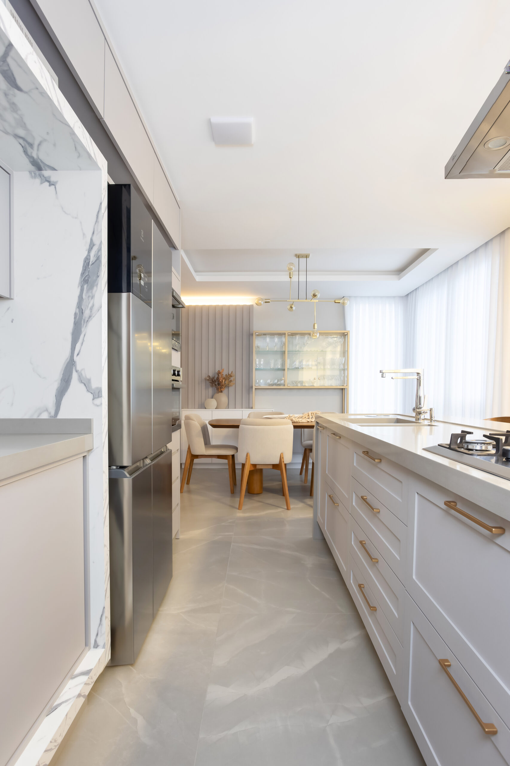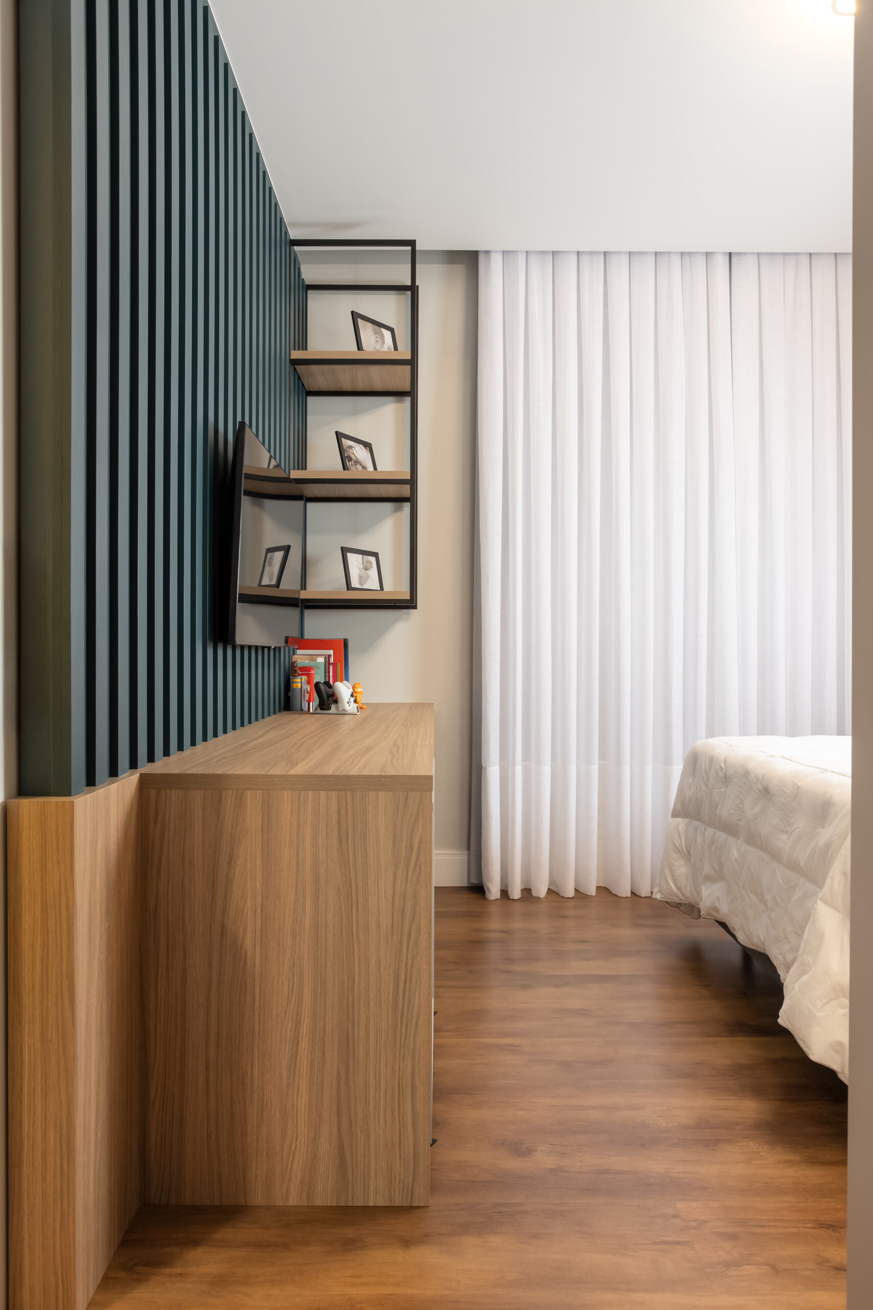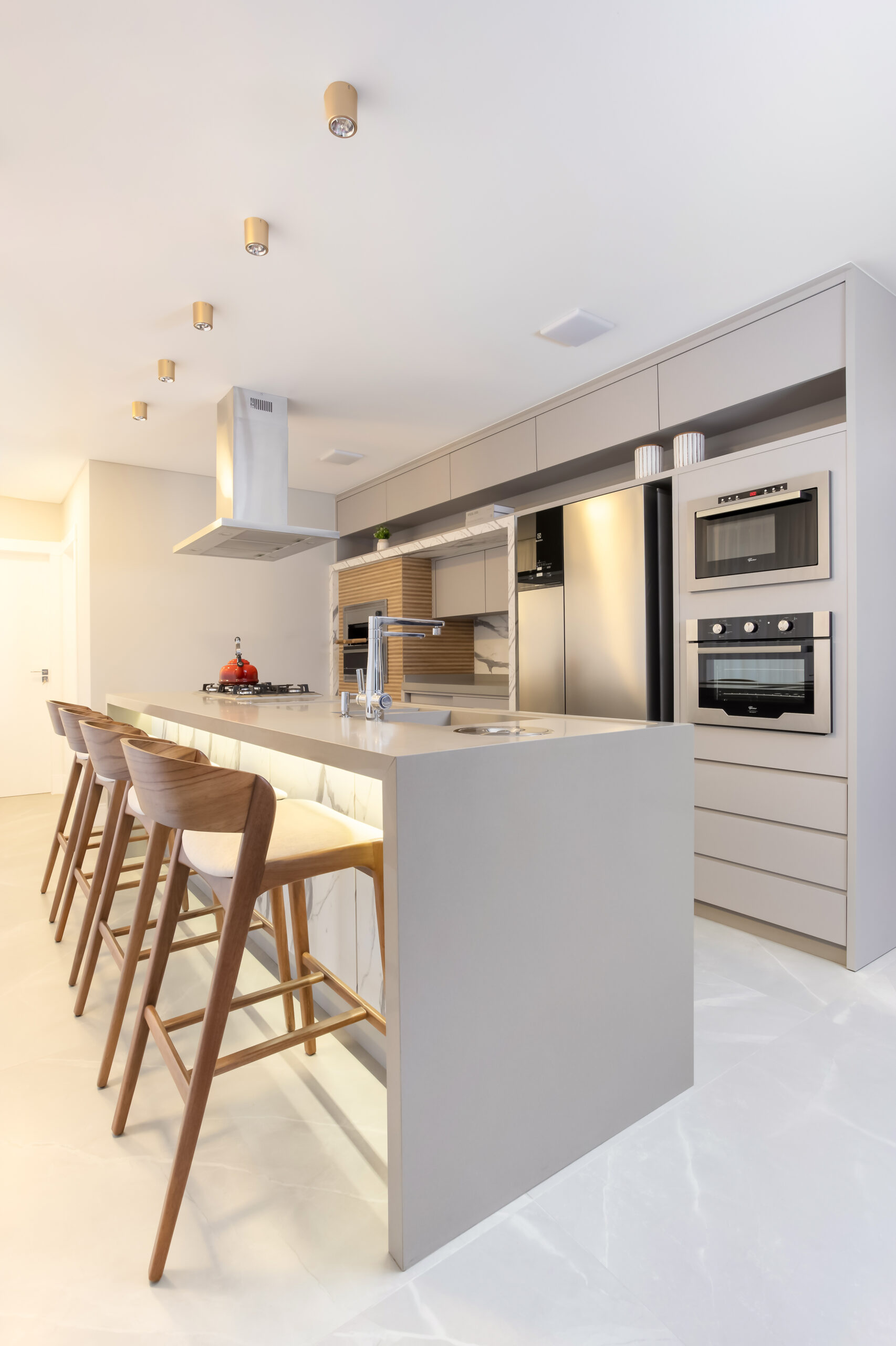 Neste projeto, a marcenaria foi concebida para dialogar com o ritmo volumétrico e a materialidade do espaço arquitetônico, oferecendo módulos planejados que se integraram aos eixos estruturais existentes. A partir de uma leitura criteriosa do entorno e da circulação, a intervenção sob medida visou garantir continuidade visual entre ambientes, aliando proporção, alinhamento e ergonomia.