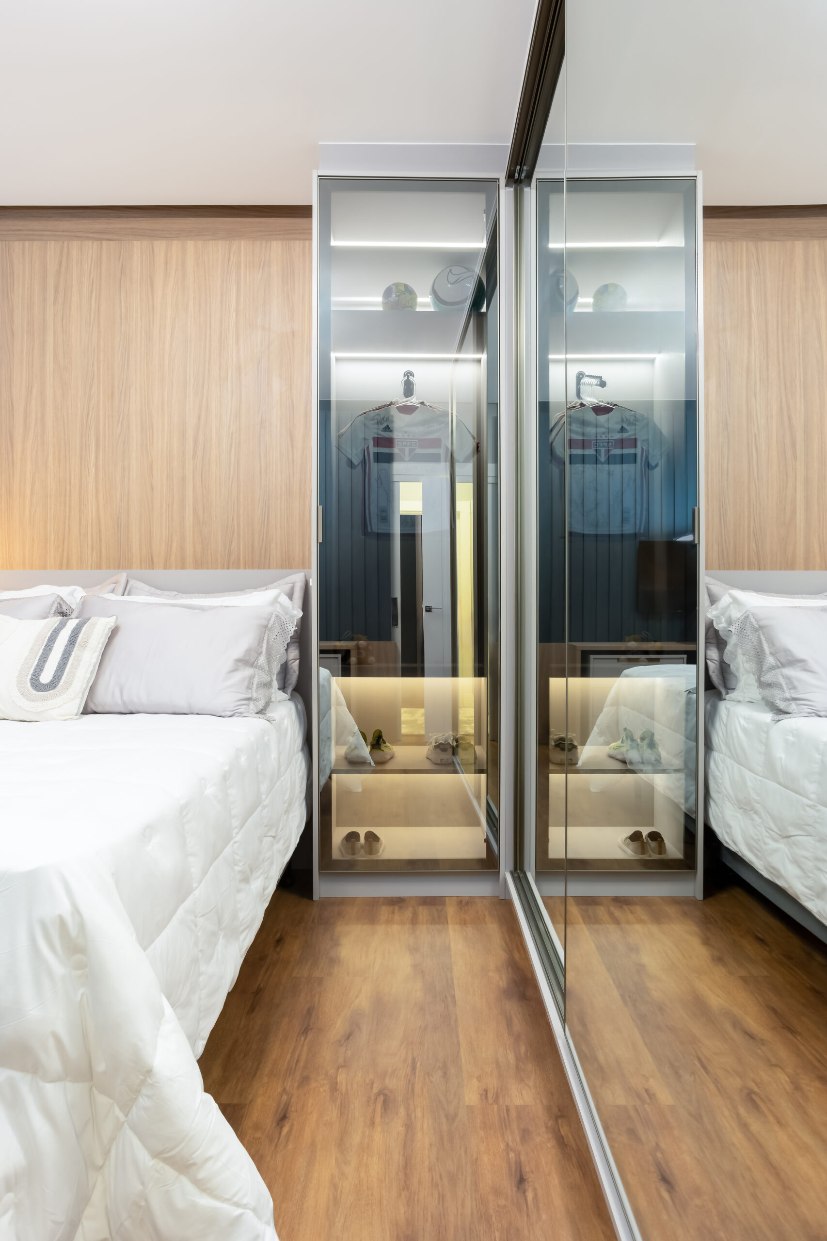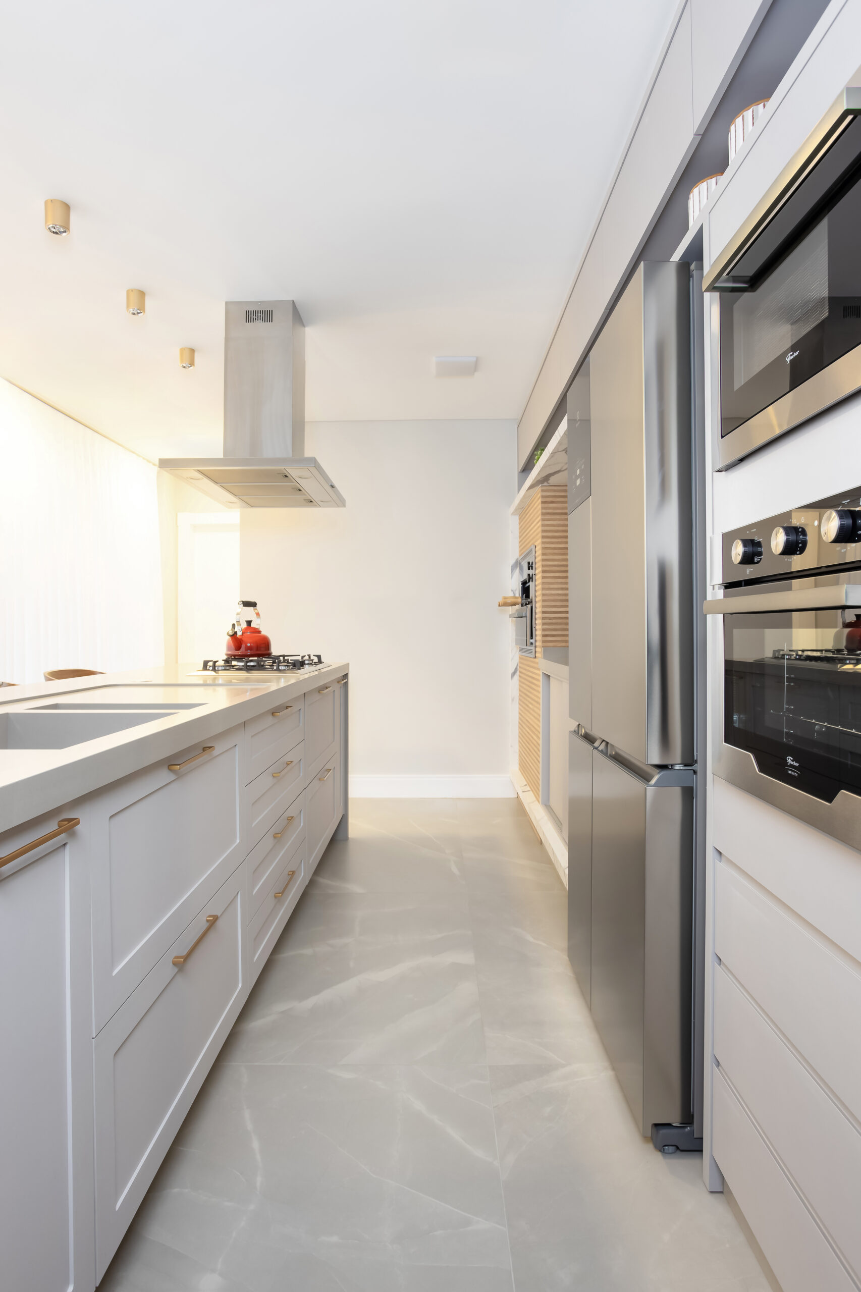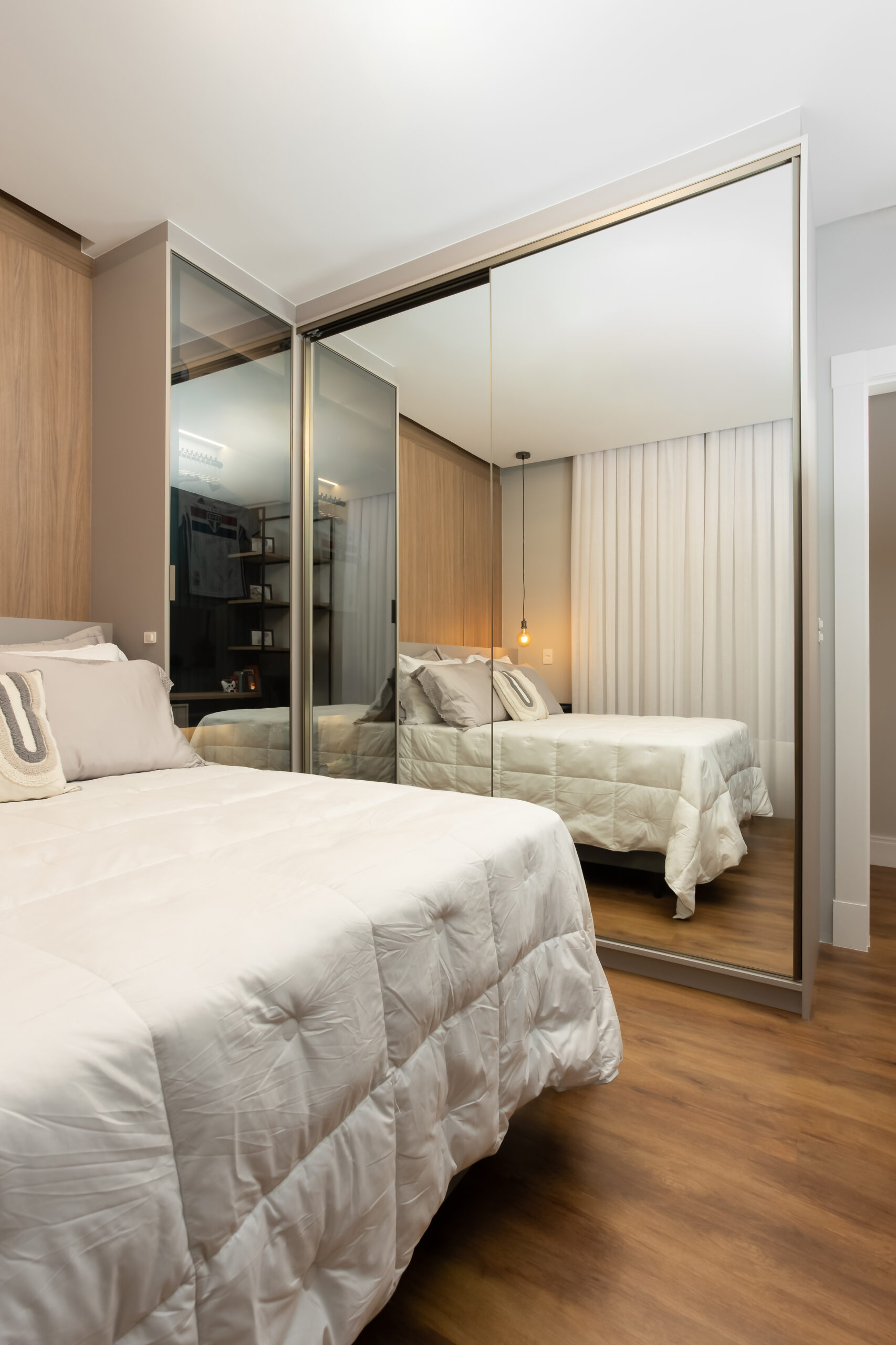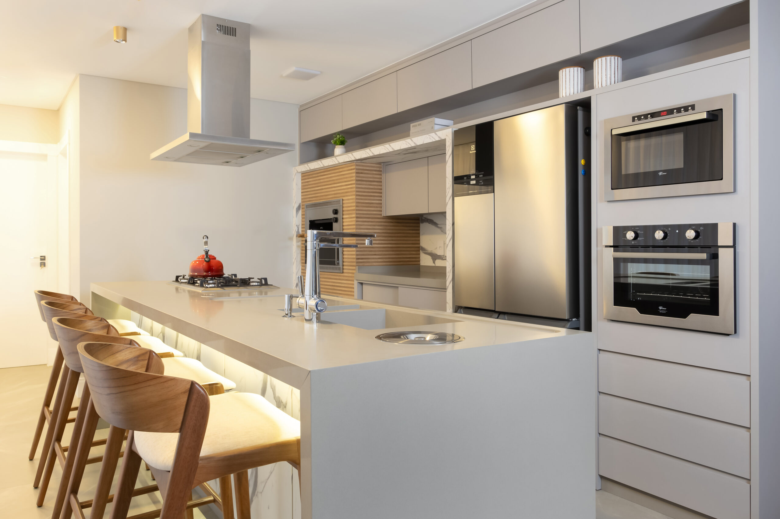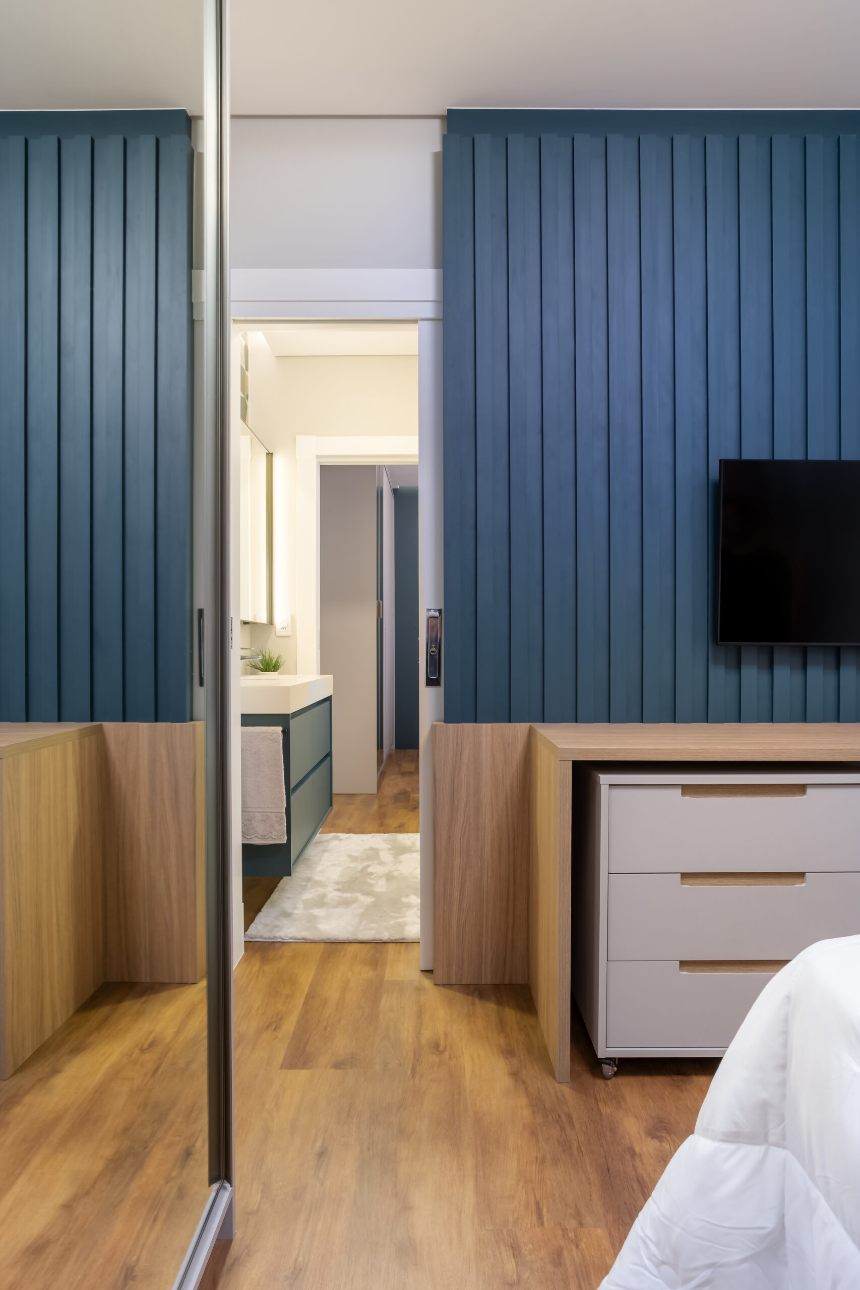 Neste projeto, a marcenaria foi concebida para dialogar com o ritmo volumétrico e a materialidade do espaço arquitetônico, oferecendo módulos planejados que se integraram aos eixos estruturais existentes. A partir de uma leitura criteriosa do entorno e da circulação, a intervenção sob medida visou garantir continuidade visual entre ambientes, aliando proporção, alinhamento e ergonomia.